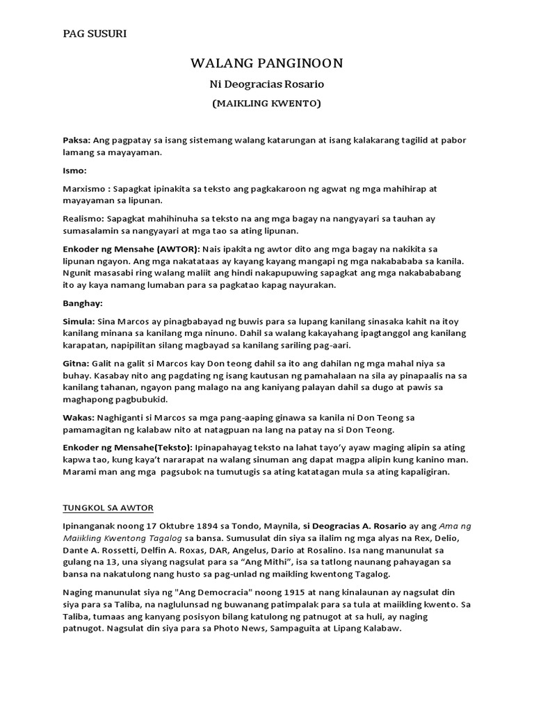 Walang Panginoon ni Deoracias Rosario basahin ng guro ang impormasyon tungkol sa may akda CPAGHAWAN NG SAGABAL Bago natin basahin ang kwento ay atin munang bigyang. Siya ay bilugan dahil noong una ay nagtitimpi pa siya sakanyang nararamdaman ngunit sa gitna ay hindi niya na ito napigilan at siya ay gumanti na kay MarcosNoong una si Marcos ay mabait nang malaon siya ay naging masamaNapilitan siyang maghiganti dahil sa binigay na taning ni Don Teong na 30 araw na. Ang aral sa kwentong Walang Panginoon ay huwag maging masyadong gahaman sa pera dahil ito ang mag dadala sayo sa kapahamakan.