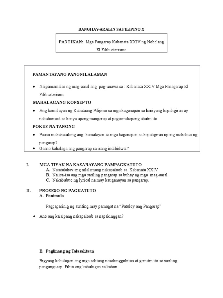 KABANATA 39 EL FILIBUSTERISMO Narito ang buod ng Kabanata 39 ng El Filibusterismo na isinulat ni Jose Rizal. Hindi nagwakas sa paglisan ni Rizal ang suliranin. BANGHAY ARALIN SA FILIPINO 10 IKAAPAT NA MARKAHAN EL FILIBUSTERISMO Aralin 41 Unang Araw -Tuklasin Pamantayang Pangnilalaman.