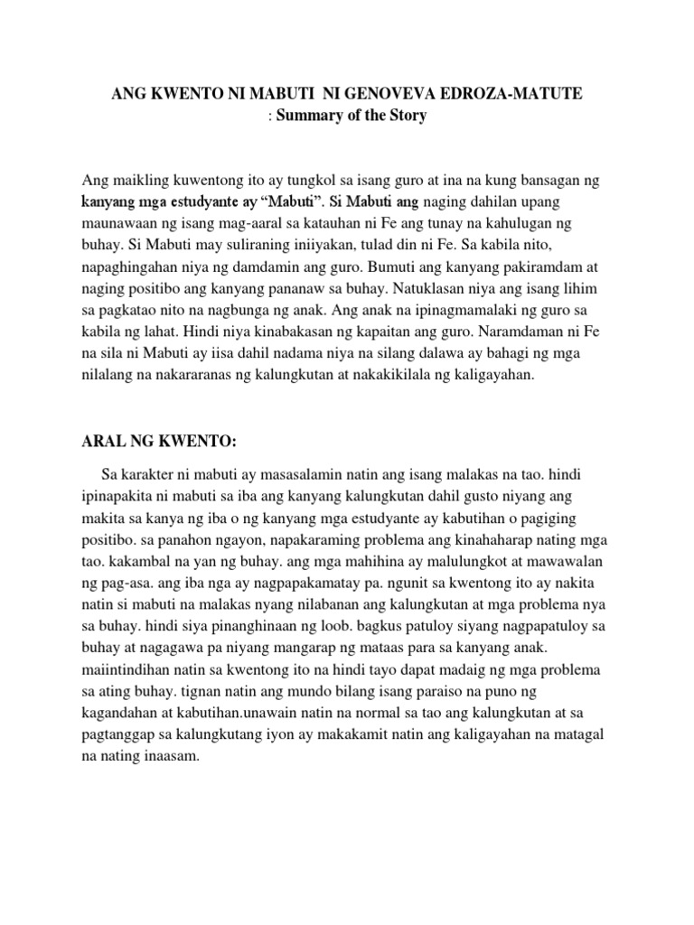 ANG KWENTO NI MABUTI NI GENOVEVA EDROZA-MATUTE. Ang ibig kong sabihin ay. Ngunit sinasabi nilang naroroon pa siya sa dating pinagtuturuan sa luma at walang pintang paaralang una kong kinakitaan sa kanya.