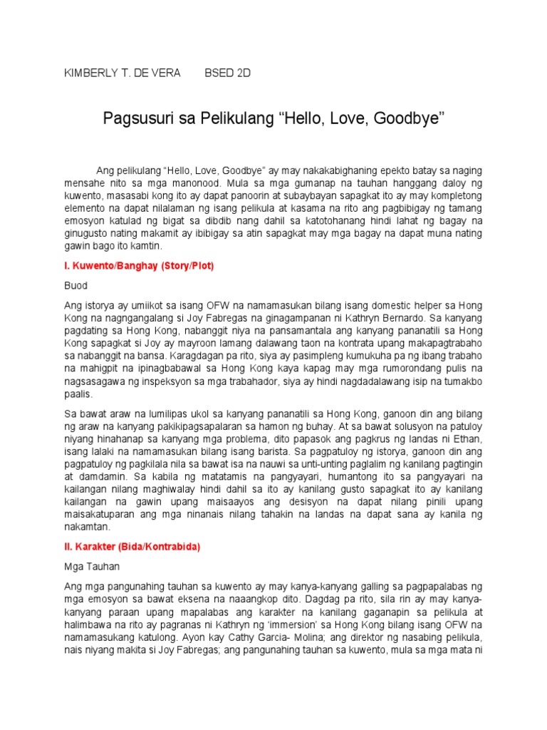 Hindi biro ang training at immersion ni Kathryn Bernardo para sa pelikulang Hello Love Goodbye. The lines that go from Nasa abroad ka kaya malamang mayaman ka to Gusto ko ng bagong sapatos or cellphone mamapapaatekuya. Implikasyon ng pelikulang Hello Love Goodbye sa mga manonood partikular na sa Overseas Filipino Worker OFW at sa kanilang buhay at buhay pag-ibig Layunin at Kahalagahan ng Pag-aaral Ang pananaliksik na ito ay patungkol sa pelikula ni Cathy Garcia-Molina na Hello Love Goodbye ng bagong tambalang Kathryn Bernardo at Alden Richards.