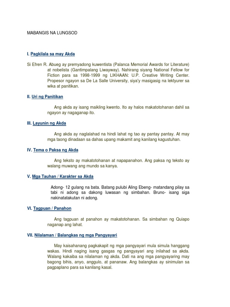 Bahagyang nagalak si Adong nang matapos ang misa subalit itoy. Mabangis na Lungsod Uri ng Akdang Pampanitikan. Utos ng Hari Ang maikling kwento ay pinamagatang Utos ng Hari sapagkat ito ay tumatalakay sa buhay ng isang mag-aaral na kontrolado ng kanyang mga guro na kung saan inilalarawan bilang hari sa kwento.