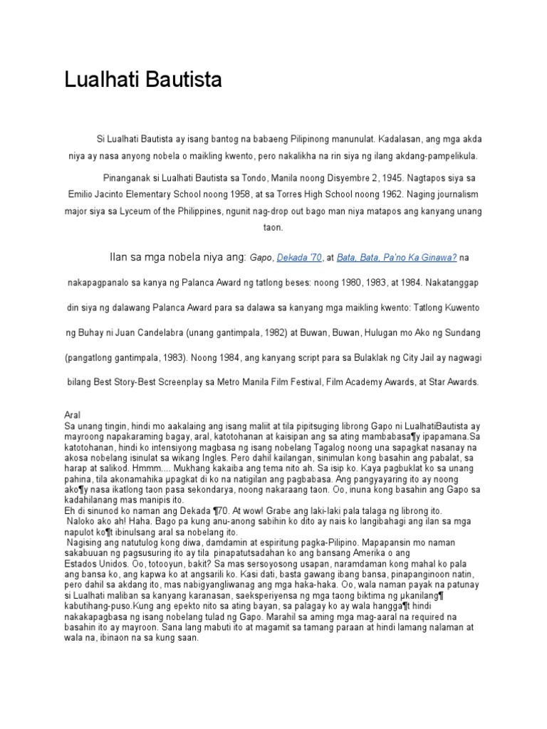 Ilan sa mga nobela niya ang. Summary ng Gapo ni Lualhati Bautista. Buod ng ibong adarna aralin 1.