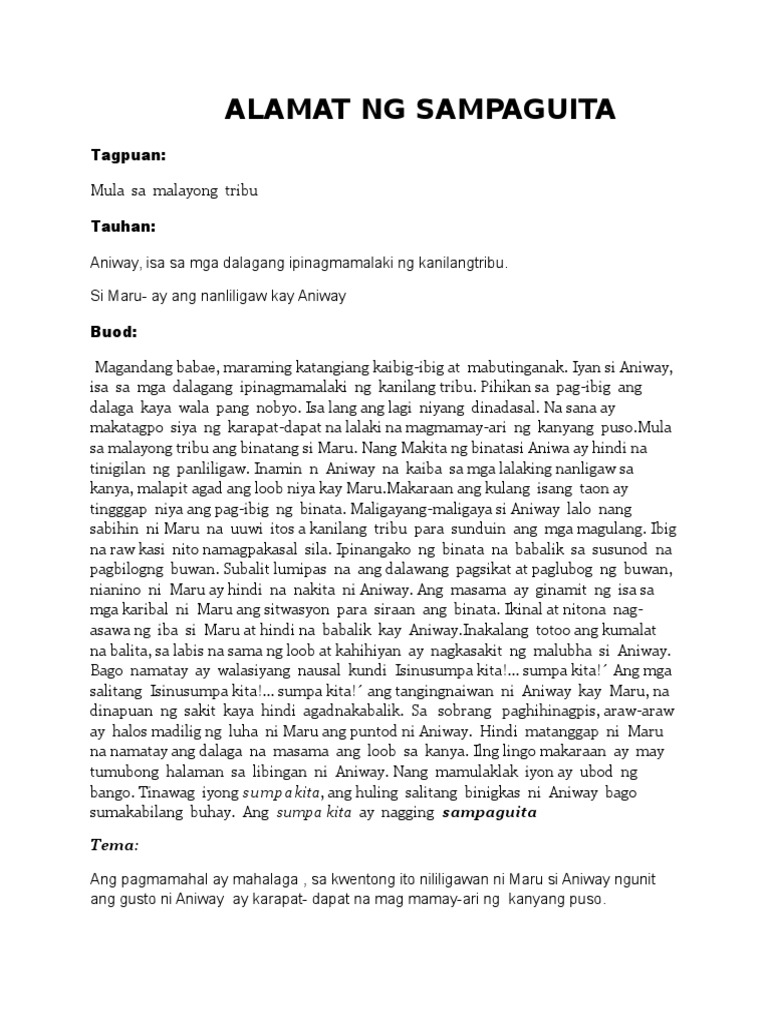 Sa mga kawayan na ito ay may lagusan kung saan nagkikita ang mag. Alamat ng Sampaguita Posted on November 26 2015 November 26 2015 by reniedoslopez Sa isang malayong bayan sa Norte ay may isang napakagandang dalaga na Liwayway ang pangalan. Ito ay isang alamat tungkol sa pambansang bulaklak ng Pilipinas.