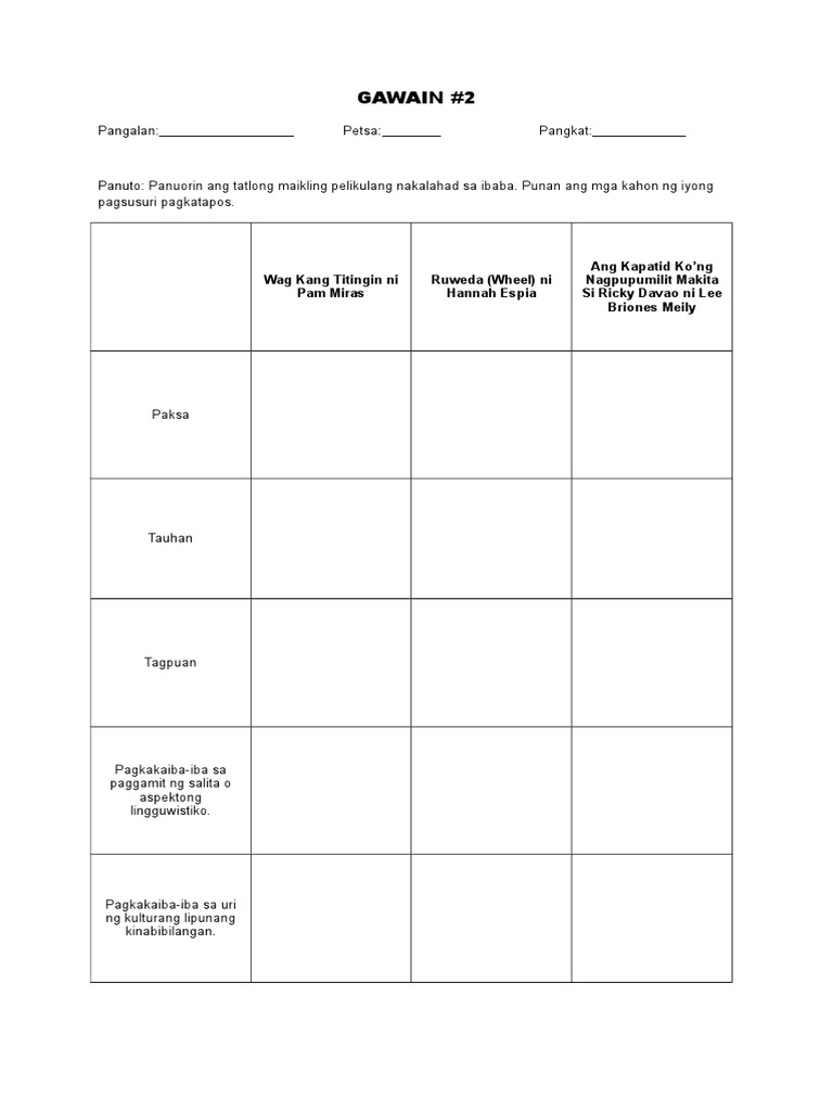 Wag Kang Titingin Ni Pam Miras Ruweda Wheel Ni Hannah Espia Ang Kapatid Kong Nagpupumilit Makita si Ricky Davao Ni Lee Briones Meily Paksa Ang paksa ng pelikulang ito ay pagmamahal sa pamilya at kung paano magsakripisyo. Wag Kang Titingin ni Pam Miras Ruweda Wheel Na Hannah Espia Pas Tahan Tagpuan Pagkakaiba paggamit ng tao aspektong lingguwistiko Pagkakaiba iba sa uri ng kultura at lipunang kinabibilangan. 2 Get Iba pang mga katanungan.